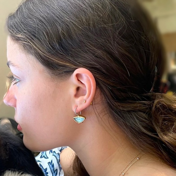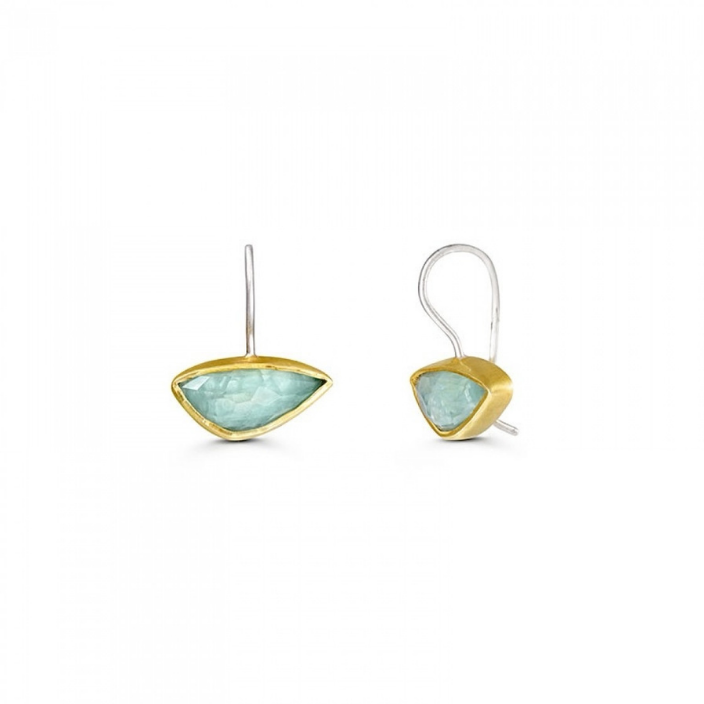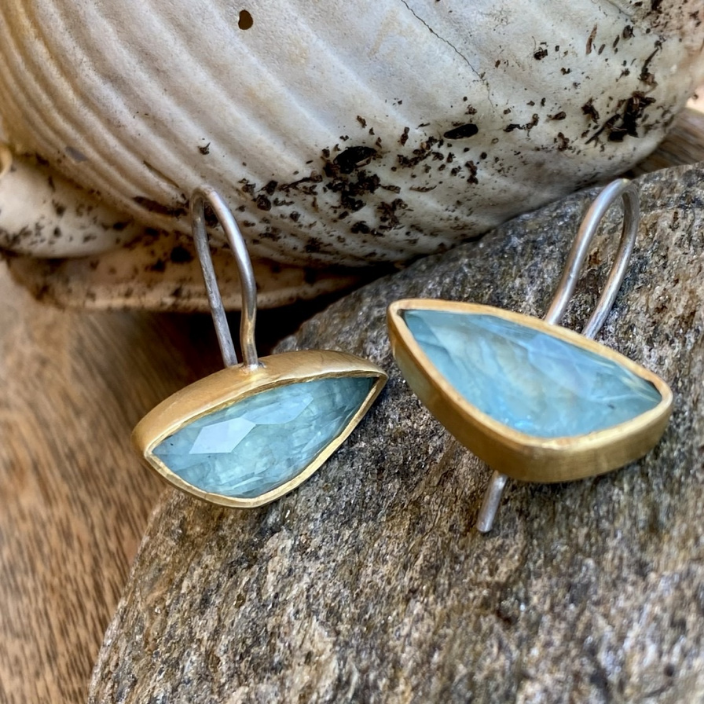 Elegant earrings with stunning triangular aquamarine doublet stones, on a handmade bezel setting. Rich with texture, luminous stones, and a mixed metal finish, they are truly exquisite.