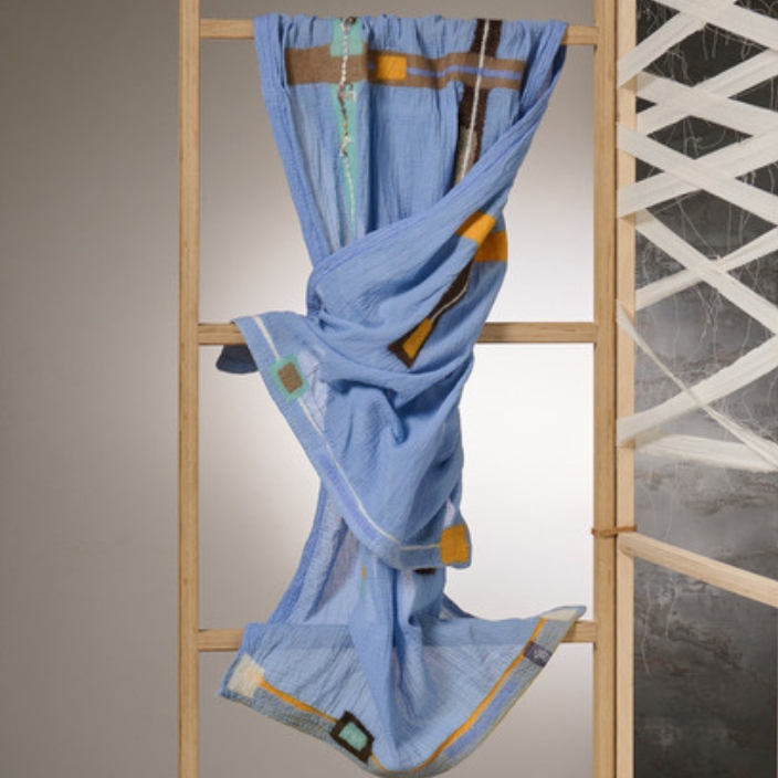 Hand-dyed periwinkle blue cotton gauze with various shades of mocha brown, mint green, mustard yellow, and lavender accents. Â